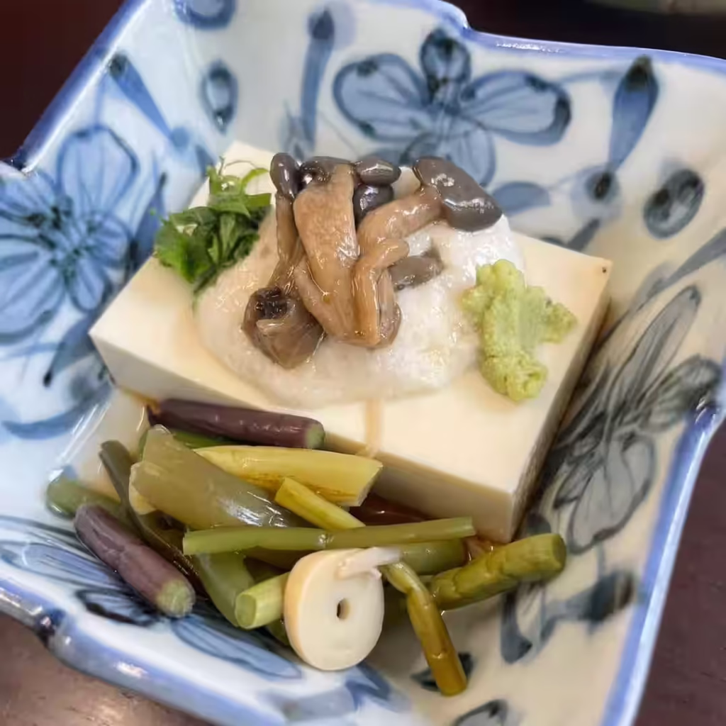 神奈川県の大山の麓にあるお店 「和仲荘」さんで豆腐コースをいただきました!大山と言えば豆腐ですが、こちらのお店の豆腐料理は一味違ったものがたくさん登場して最初から最後まで楽しめました。まずお茶請けとして出たのが #お豆腐の寒天寄せ です。甘い寒天に崩した豆腐が入っていて、甘い物と豆腐の相性に驚きでした。それから写真7枚目の白いものは 豆腐グラタン です。スプーンですくうと中に豆腐がごろっと入っていて、ゆるめのクリームソースと合っていました。