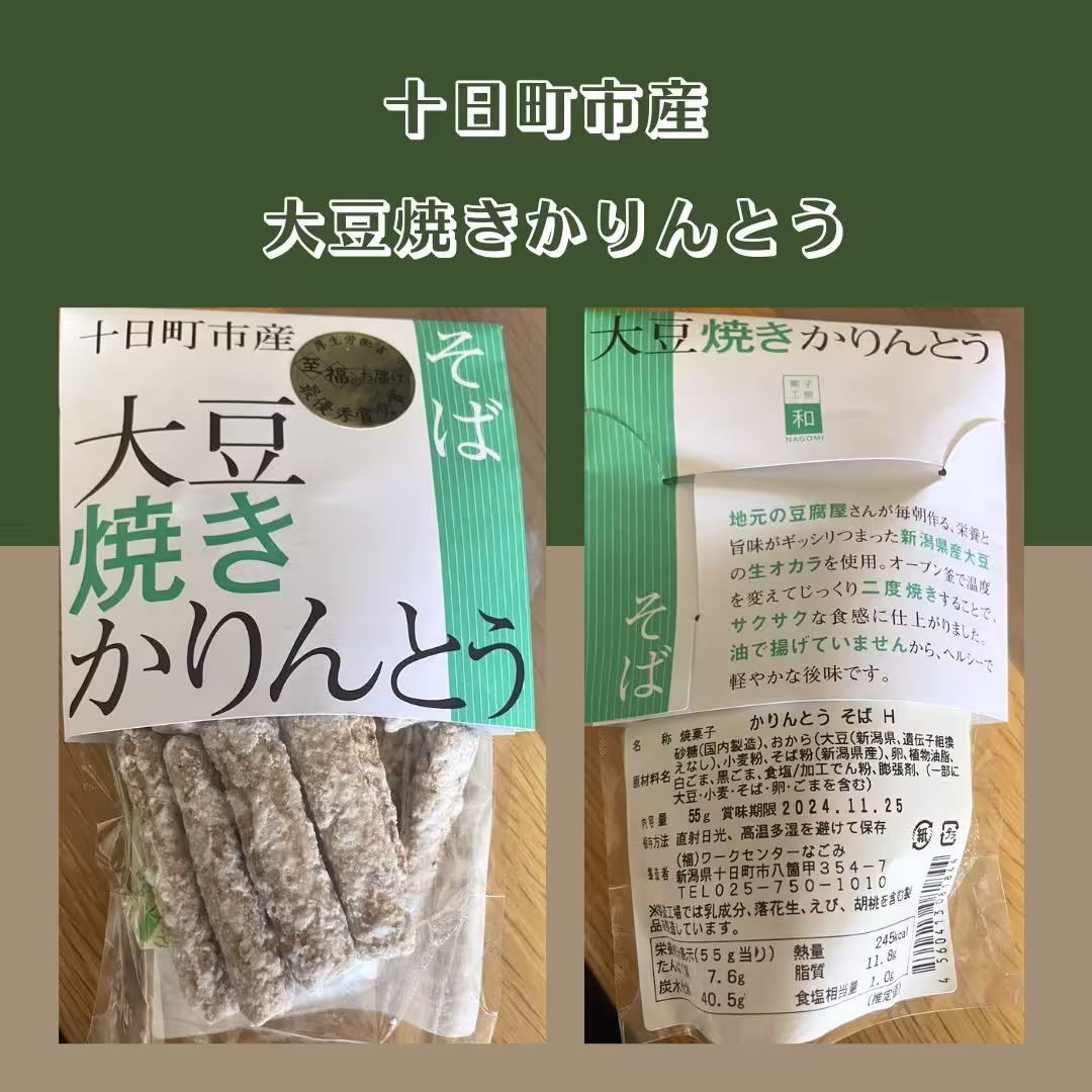県内産の大豆を使った地元のお豆腐屋さんのおからを使用した焼きかりんとう。へぎそばが有名であるこの地方ならではのそば粉入りで、地元のものをたっぷり使っているところに惹かれ、購入しました。